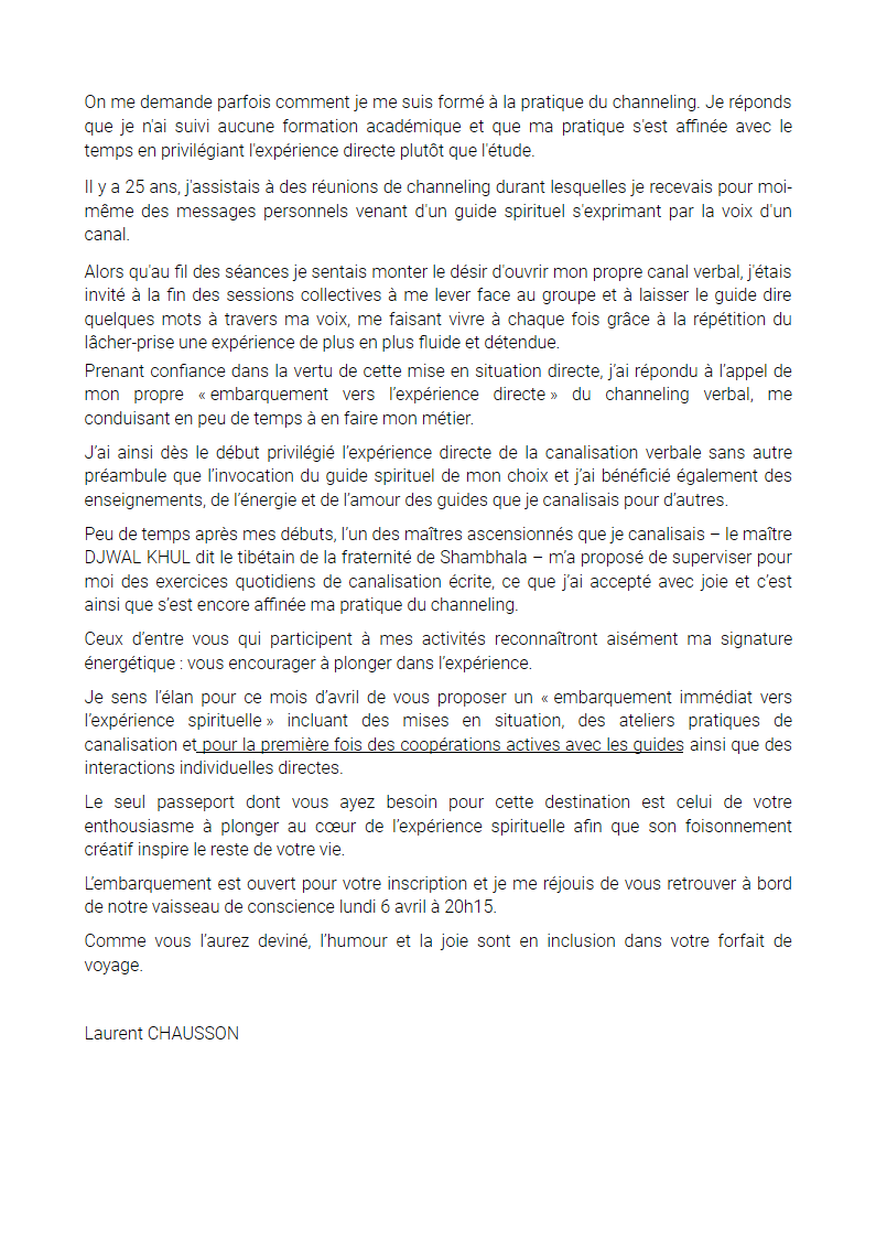 Prenant confiance dans la vertu de cette mise en situation, j’ai répondu à l’appel de mon propre « embarquement immédiat » vers l’expérience directe du channeling verbal...(lire la suite).
